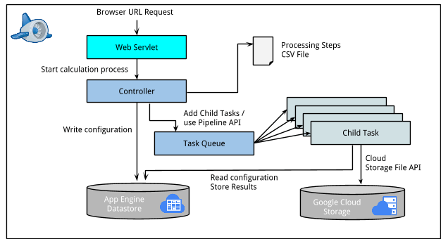 • The application core (controller) which controls the processing of the image data. It reads the processing steps and puts new tasks into the task queue. We have also implemented the usage of the Pipeline API as an alternative. In both cases we interact with the App Engine Datastore for storing configuration of the individual tasks.